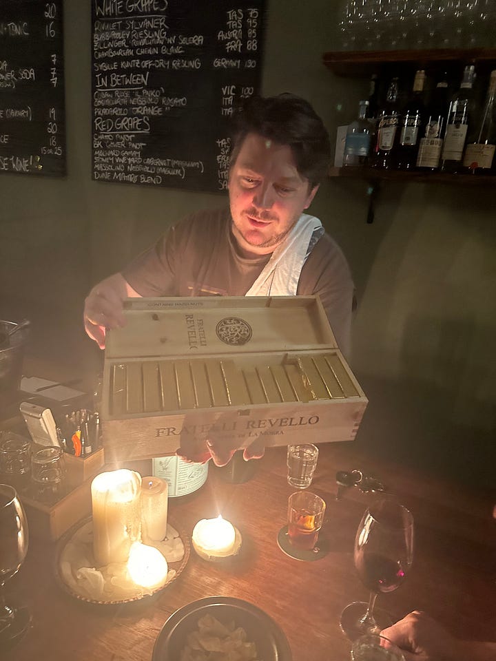 Sonny Wine Bar: This tiny, hole in the wall, bar is an absolute MUST. The ever-changing seasonal menu is pint-sized too and perfectly so, as there’s basically no decision making. At Sonny, you can just enjoy the starter of the day (something like a jamon on toast), couple of mains (usually a delicious pasta) and dessert at the bar while the natural wines and champagne flow to the sound of Bowie on the record player. One of my favourite moments was when at the end of our meal, the owner pulled out a beautiful timber box with hand made chocolate wrapped in gold foil, inviting us to have one. Delightful.
